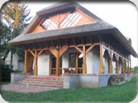 lakóépületek. Az egykori telepesek szalmatetős viskóit, girbegurba